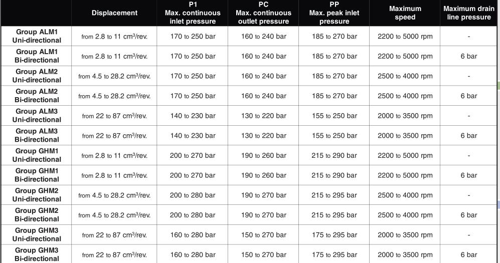 第一級,低排量,高壓:1.1 cc/rev 至 3.2 cc/rev;P1 在 230 巴