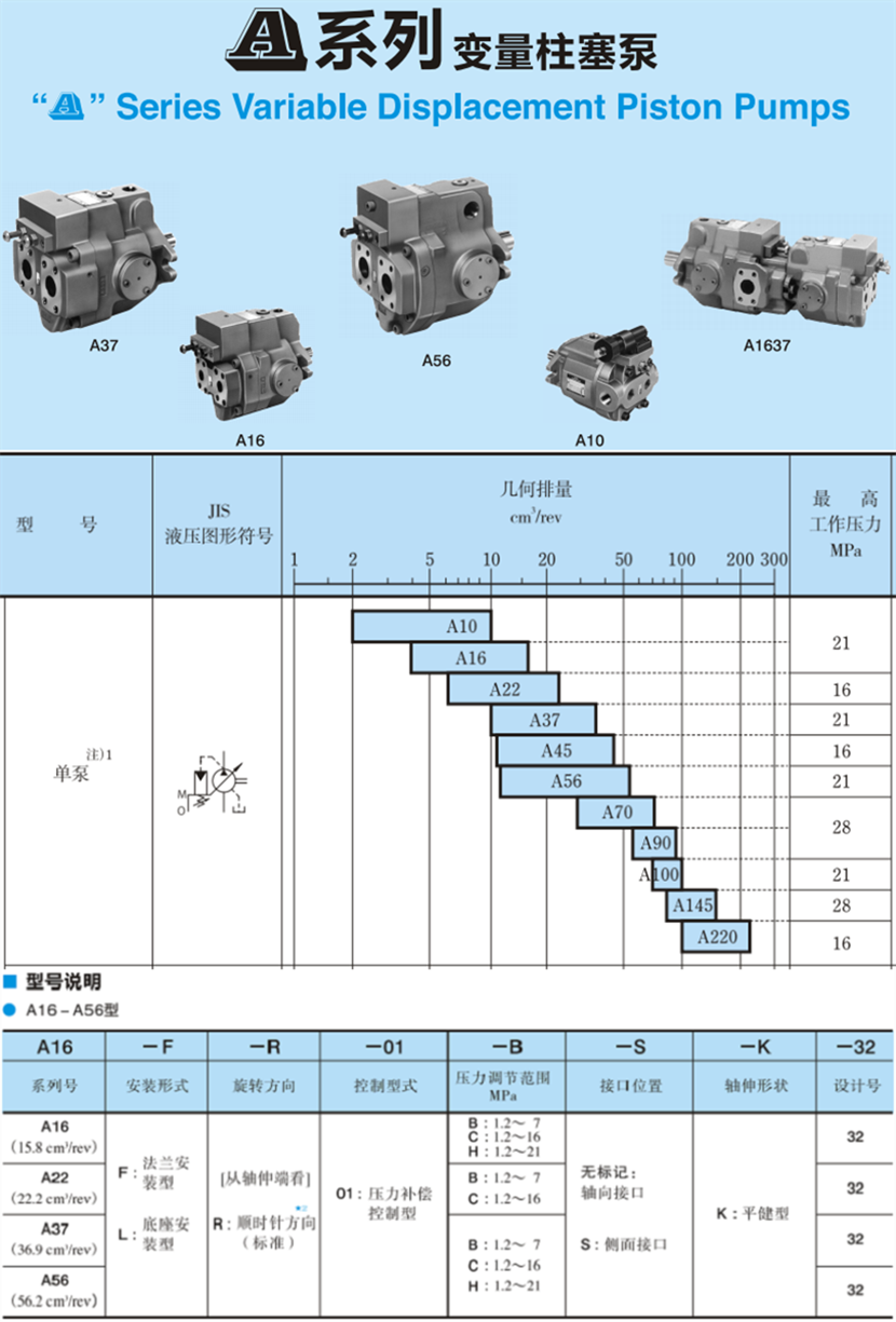 排量?:A56系列柱塞泵的排量通常為56.2 cm3/rev(名義排量約為56 cm3/rev)。