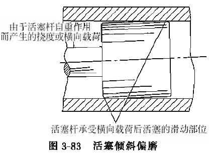 1、活塞與缸孔間隙太大。若活塞與缸筒內(nèi)孔配合間隙太大,在長(zhǎng)度很大的活塞桿自重作用下, 活塞桿撓曲,或者即使活塞桿不撓曲,但由于自重,產(chǎn)生的彎曲力矩若大于活塞的傾覆力矩時(shí), 則活塞將處于傾斜姿勢(shì)沿缸壁運(yùn)動(dòng)而發(fā)生偏磨, 如圖3-83所示。