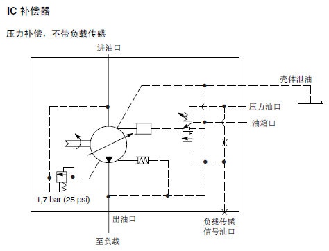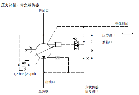 彈簧腔(控制)壓力與出口壓力之間隔著一個內(nèi)部節(jié)流孔。當(dāng)節(jié)流孔壓降達到壓差設(shè)定值時出口壓力使閥芯移動,泵排量減小。