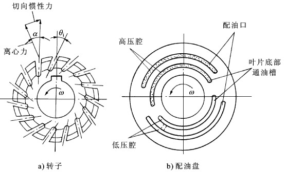 上述工作原理表明,改變定子與轉(zhuǎn)子偏心距的方向也就改變了泵的吸、壓油口,即原來的吸油口變成壓油口,原來的壓油口變成吸油口;改變上述偏心距的大小意味著改變了泵的排量。 當(dāng)偏心量為零時(shí),密封容腔不會(huì)有容積變化,因此也就不具備液壓泵的工作條件了。同樣道理,為了使葉片運(yùn)動(dòng)自如、減小磨損,葉片槽通常向后(注意,這里與雙作用葉片泵不同)傾斜20o~30o。 圖3.20為單作用 葉片泵的配油盤和轉(zhuǎn)子結(jié)構(gòu)簡圖。